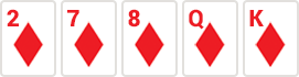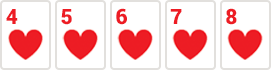 Five cards in numerical order and are all of the same suit. This is similar to a “Royal Flush” with the only exception being that it does not contain an Ace. In instances where multiple players have a Straight Flush, the one with the highest high value card wins.